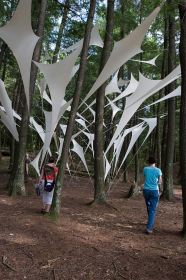 The installation "Tornado" invades an open space in the forest, a clearing in between the trees. The white, slim and quick pieces of cloth are forming a circuit, an orbit of movement, spiraling up like a swarm of birds. Creating at the same time an open space inside, which can easily be accessed. The installation will give the visitor a calm place inside the rapid movement, the ‚eye’ of the tornado, a space for contemplation, for stopping and staying, for being out of the ‚rush’ and rotation of everyday-life.